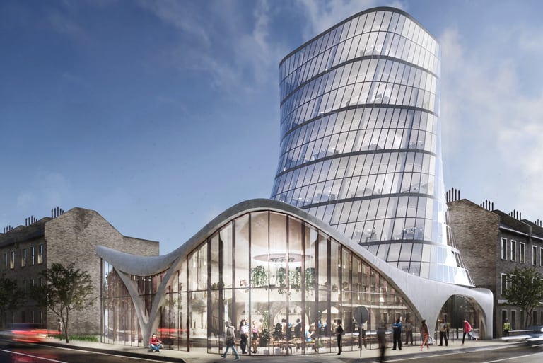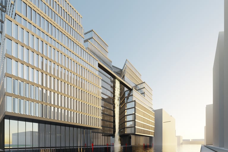 Waterfall Wellness - St. Mary's Hospital, London. A design solution for a hospitol in located by Paddington Basin Canal that takes advantage of the proximity to water as a healing element