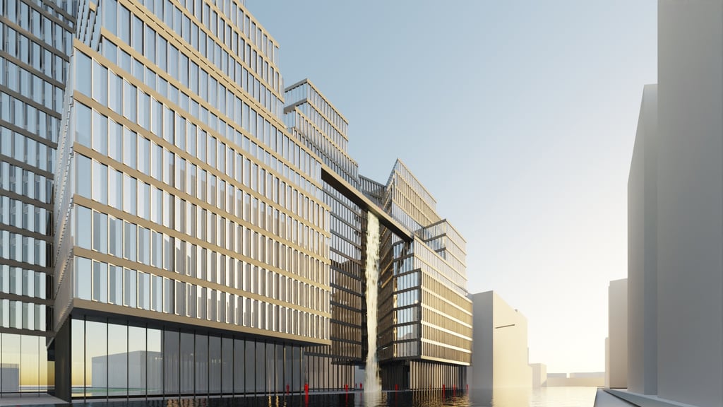 Waterfall Wellness - St. Mary's Hospital, London. A design solution for a hospitol in located by Paddington Basin Canal that takes advantage of the proximity to water as a healing element