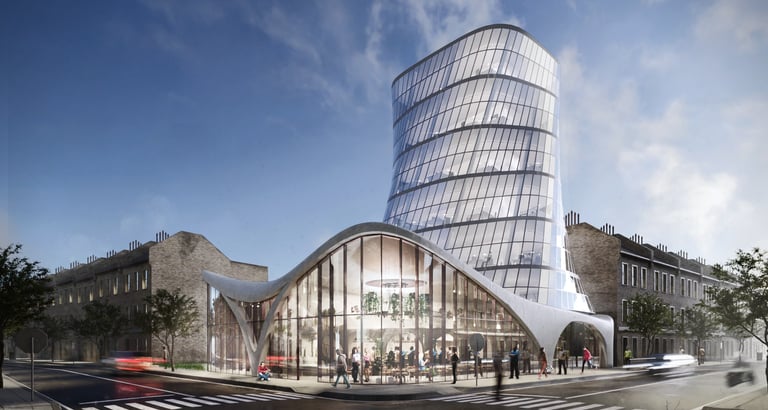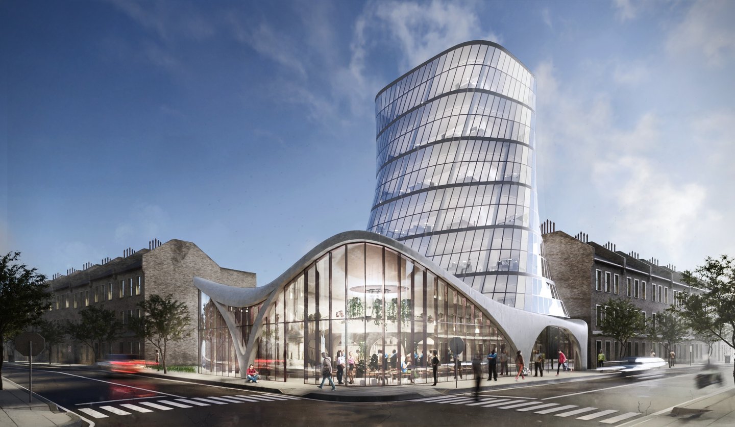 A six storey corner office building with a generous podium that contains retail and restaurant space, opening up and welcoming from its corner lot position.