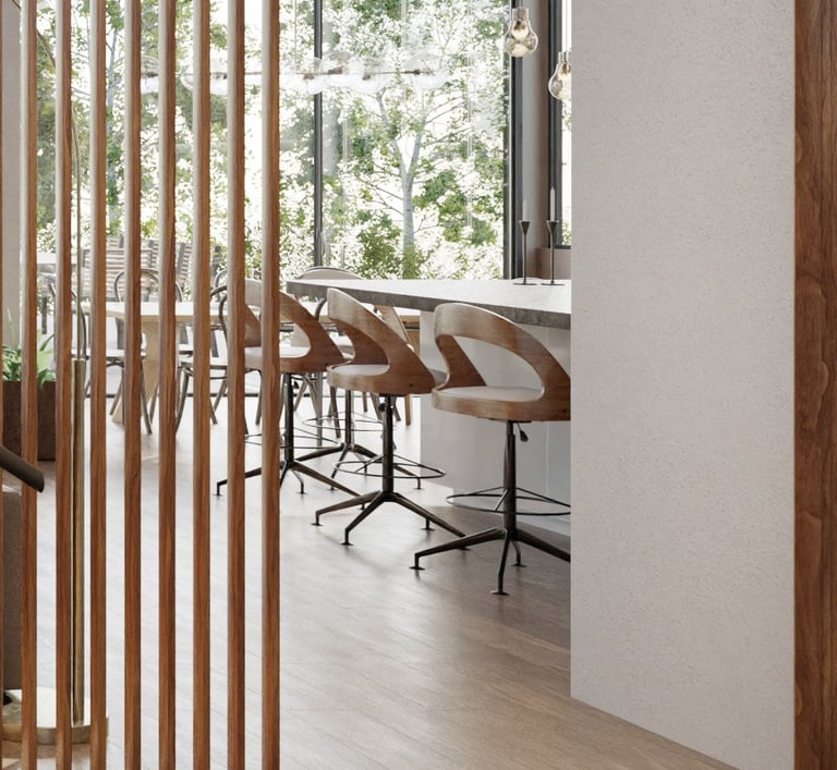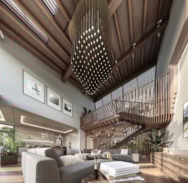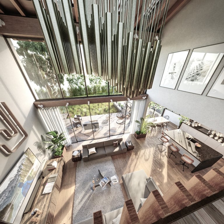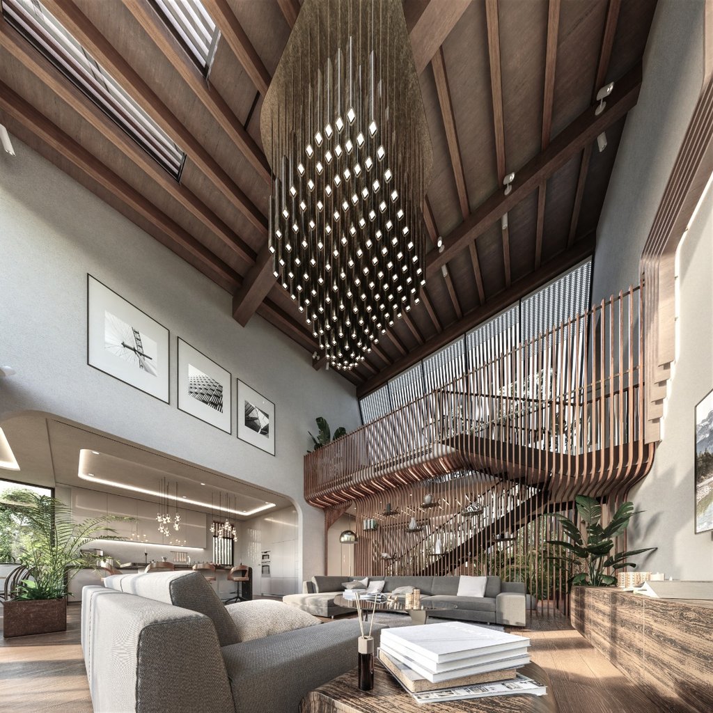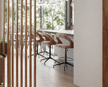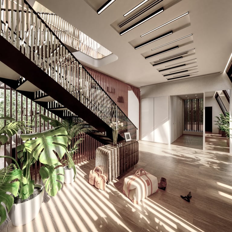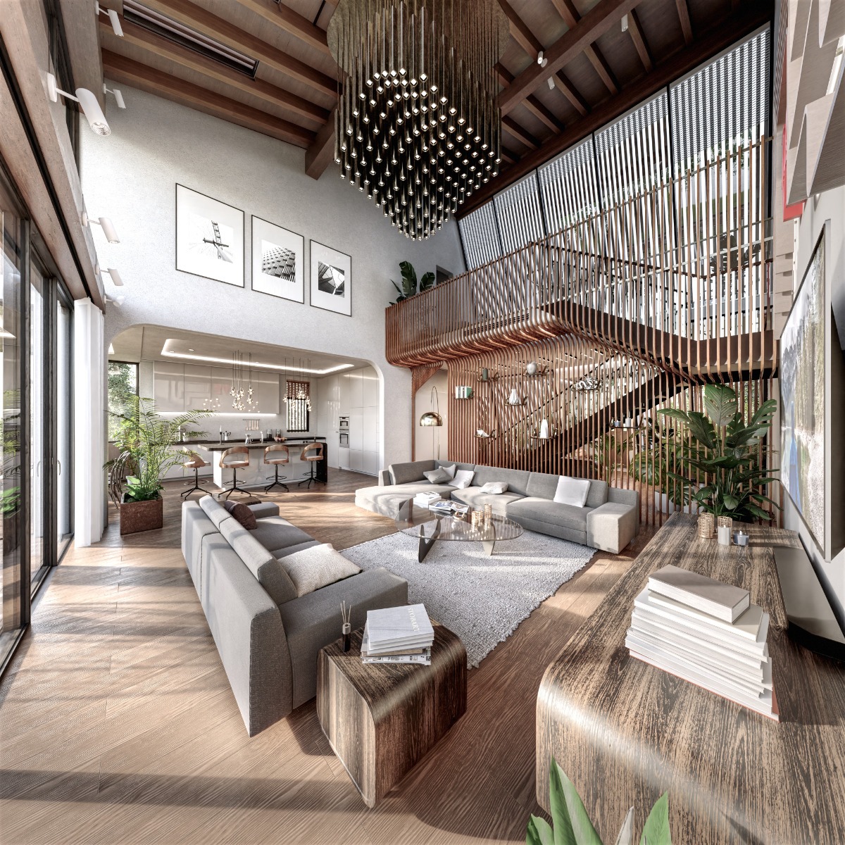 The home is centered around a double height open living area that is visible through most areas and connects to the Kitchen and dining area. The entrance exerience is combined, yet separate from the living area, with strong light filtering through the Japanese-inspired slat based windows.