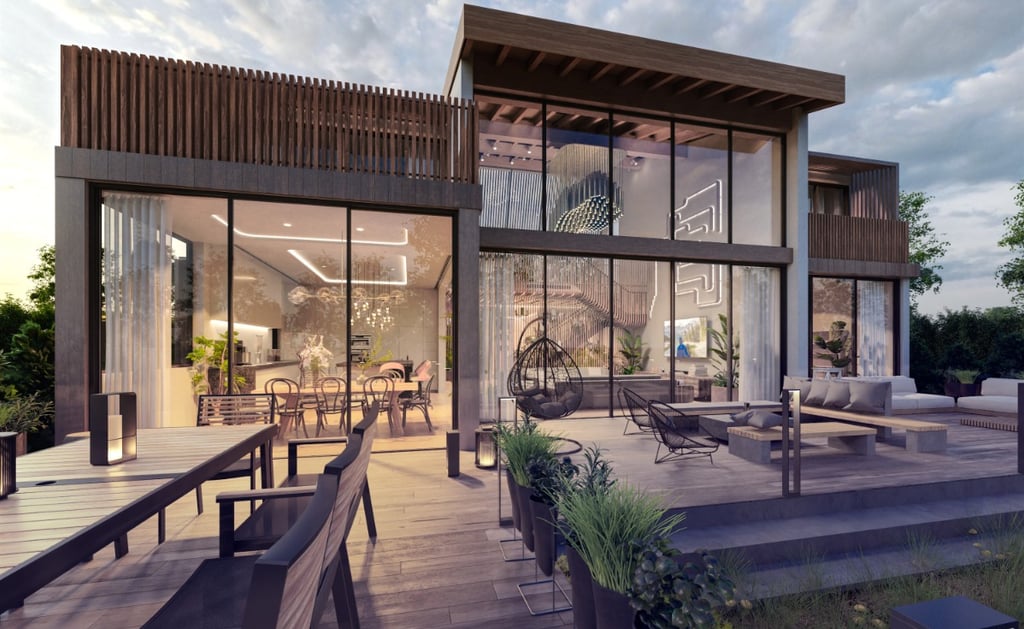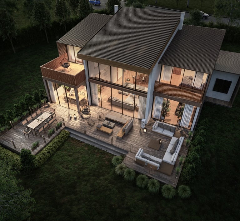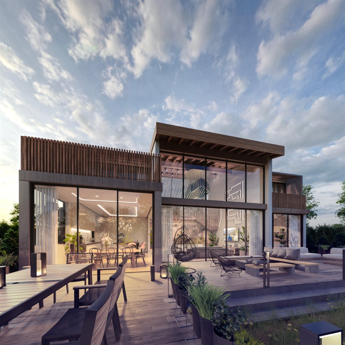 The exterior consists of strong and sharp lines, that are both further enhances and softened by the timber slats used through the sides, parapets, and roofs. The concept behind the exterior is to give the house a sense of a vacation home lodge feeling combined with a strong presence.