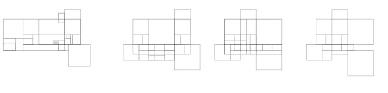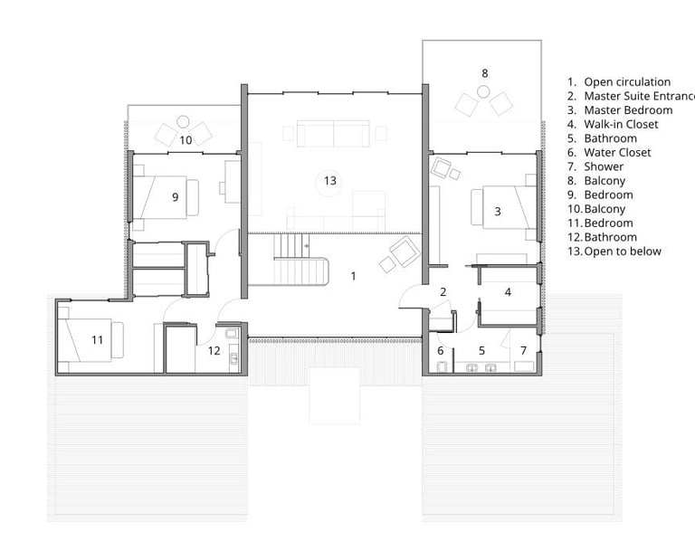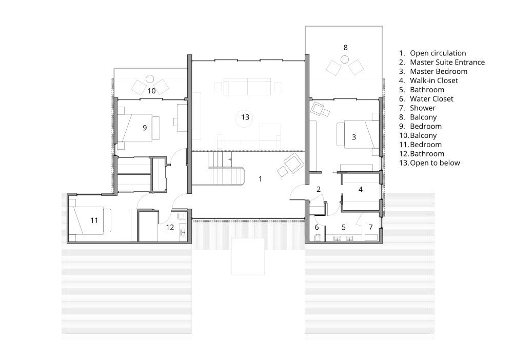 The rhythm of the house is composed of the central double height living and circulation space. The wings on either side are largely symmetrical, with the dining area protruding beyond the symmetry on one side and a bedroom protruding in the diagonal opposite of the house in the other wing.