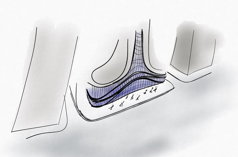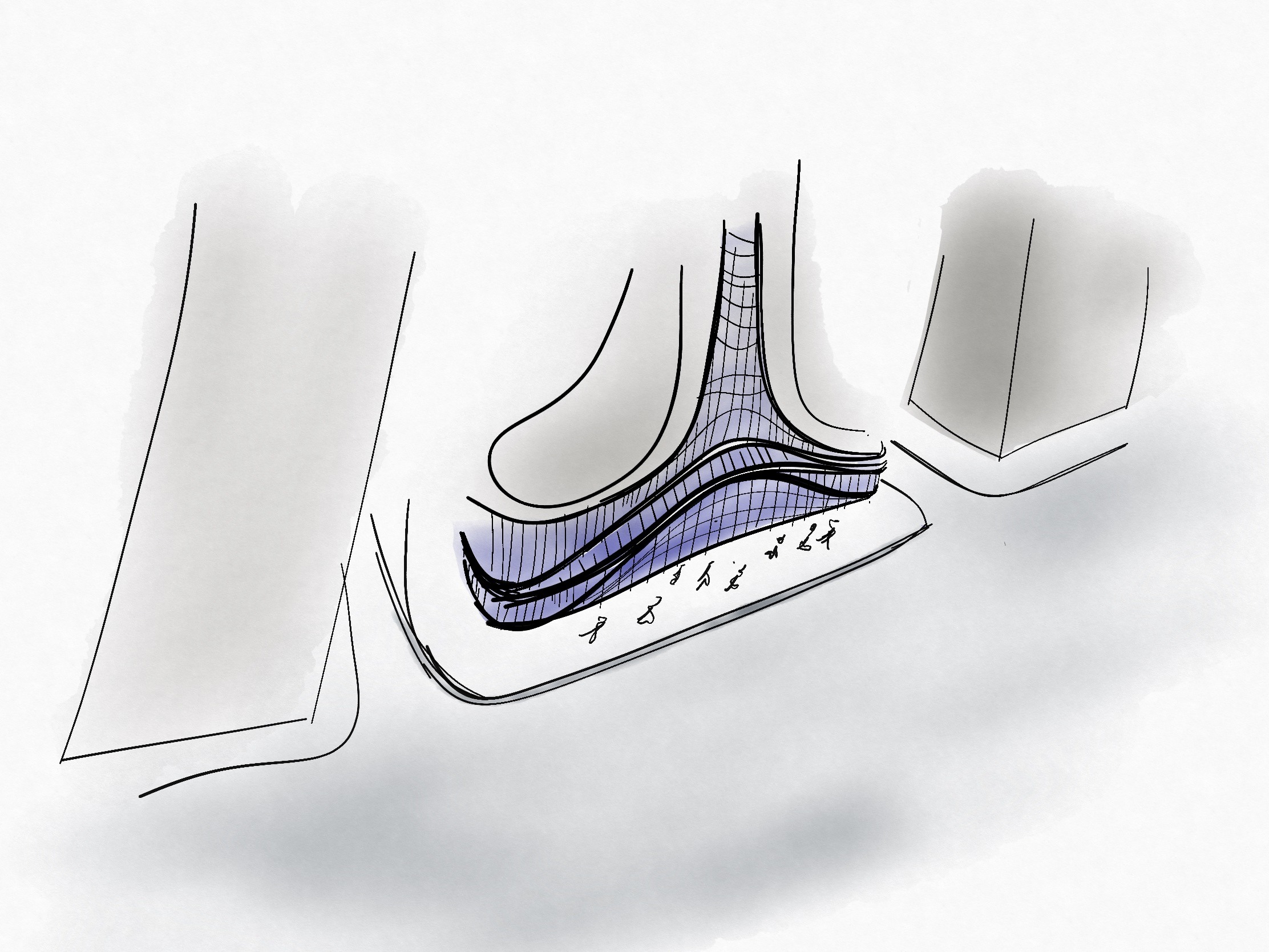 As is typical for projects involving this level of geometrical complexity, the project starts completely in three dimensions, where it is iteratively sculpted. Each subsequent iterations aims to be an improvement over the previous one, taking into account both functional and aesthetic qualities. Generating large column-free spaces is essnetial to developing the design.
