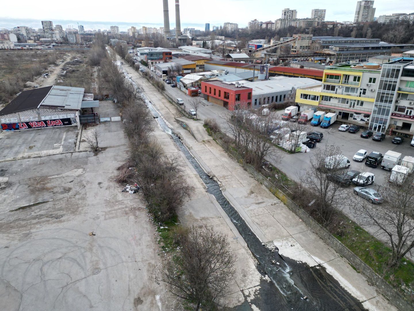 Vision for Vladayska river in Krasno Selo neighbourhood in Sofia, showing the current condition and the possibility of rewilding the riverbed with an adjacent linear park