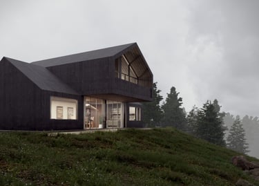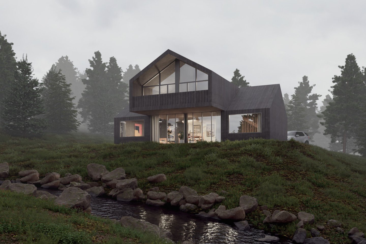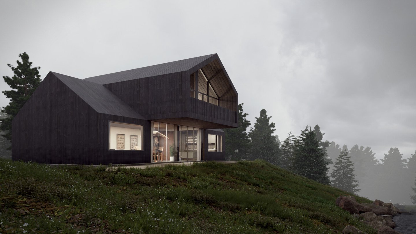 The house consists of two volumes stacked and rotated ninety degrees. The ground level consist of living space and the upper level contains three en-suite bedrooms. The concept behind the house is to connect to the secluded beautiful scenery to in as many levels as possible. Large windows overlook directly to the area in front and the house is clad in smoked charred smoked oak.