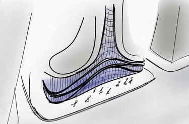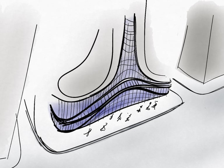 As is typical for projects involving this level of geometrical complexity, the project starts completely in three dimensions, where it is iteratively sculpted. Each subsequent iterations aims to be an improvement over the previous one, taking into account both functional and aesthetic qualities. Generating large column-free spaces is essnetial to developing the design.